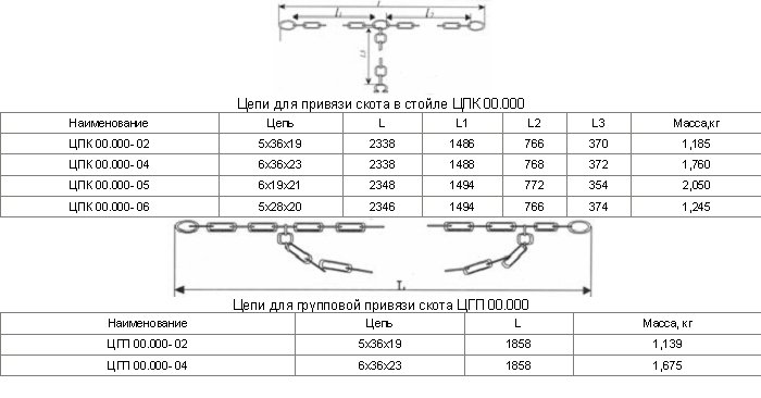 Цепи хозяйственные изготавливаются по РСТ УССР 1592-90 и предназначены для привязи, привязи-отвязи и вождения рогатого скота, собак и других хозяйственных и бытовых нужд. Изготовленные из стальной низкоуглеродистой проволоки общего назначения, цепи для скота широко применяются на сельскохозяйственных предприятиях и в животноводстве - в крупных и небольших коровниках для привязи скота, на пастбищах - для вождения. Цепи для привязи делятся на два основных типа - групповые и индивидуальные