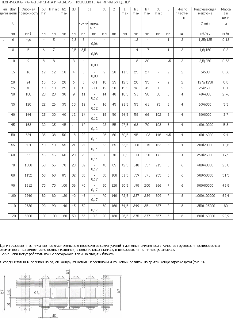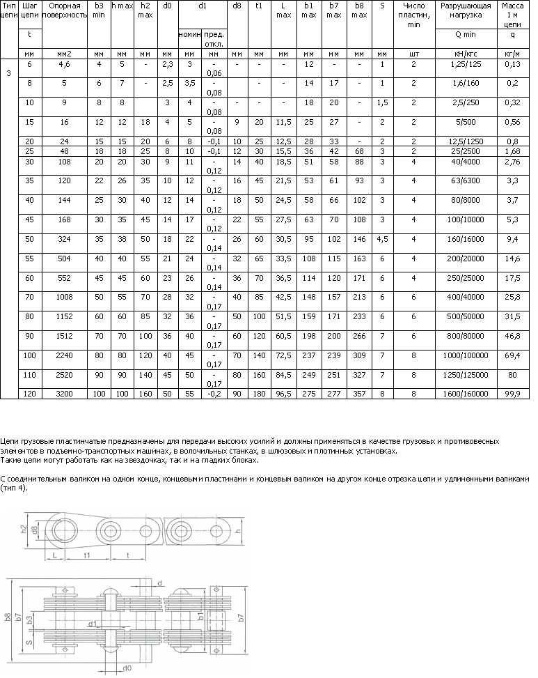 ·Bип 3 - цепь грузовая пластинчатая с соединительным валиком на одном конце, концевыми пластинами и концевым валиком на другом конце отрезка цепи;