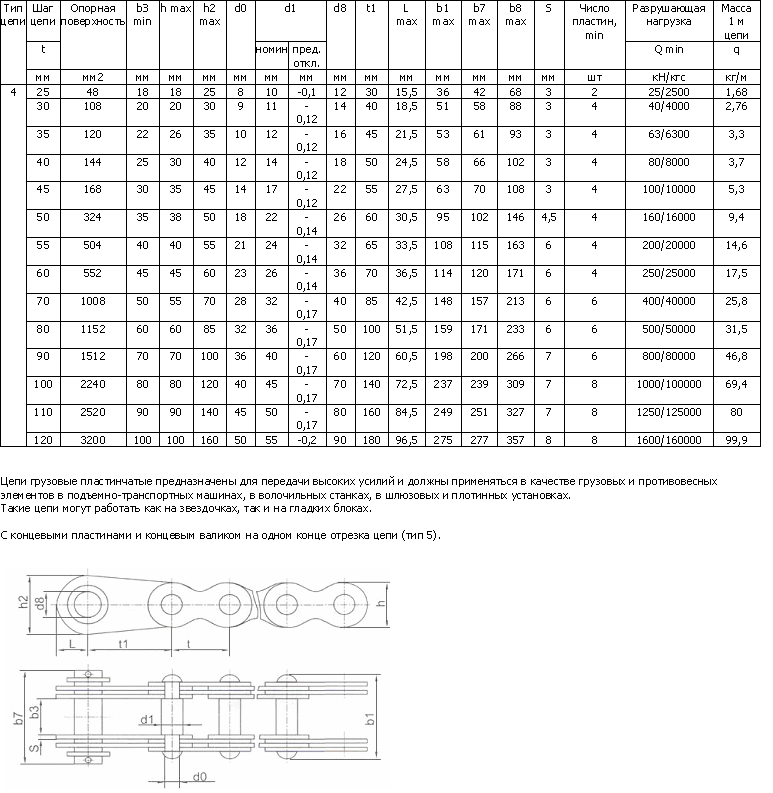 - Тип 4 - цепь грузовая пластинчатая с закрытыми валиками с концевыми пластинами на обоих концах отрезка цепи;