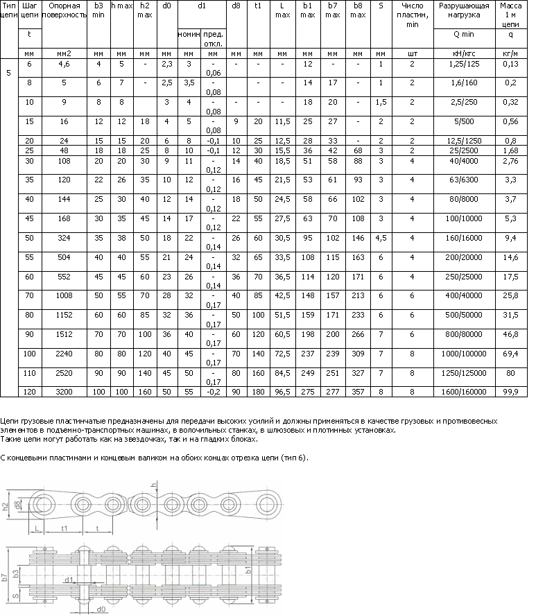 - Тип 5 - цепь грузовая пластинчатая с закрытыми валиками с соединительными валиками на обоих концах отрезка цепи;