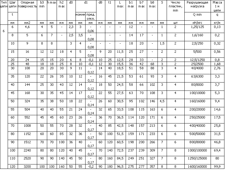 ·Bип 6 - цепь грузовая пластинчатая с концевыми пластинами и концевым валиком на обоих концах отрезка цепи.