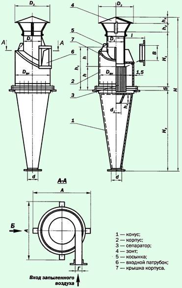 Циклон типа Ц состоит из корпуса, конуса, входного патрубка, зонта и выхлопной трубы с сепаратором. Наличие сепаратора в нижней части выхлопной трубы способствует дополнительному раскручиванию запыленного потока воздуха и, тем самым, увеличению эффективности очистки воздуха. В нижней части сепаратора установлено коническое кольцо, исключающее захват взмученных мелких частиц пыли потоком очищенного воздуха.