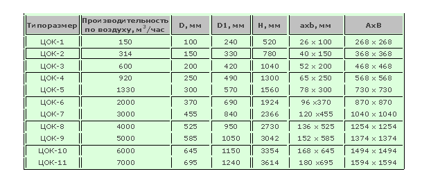 Циклон эффективно работает при запылённости входящего не более 20 г/м3. Эффективность очистки циклона 92-98% и зависит от характера и дисперсности пыли, а так же от типоразмера циклона. Циклоны изготавливаются в климатическом исполнении УХЛ с категорией размещения 1,2,3 и 4 по ГОСТ 15150-69.