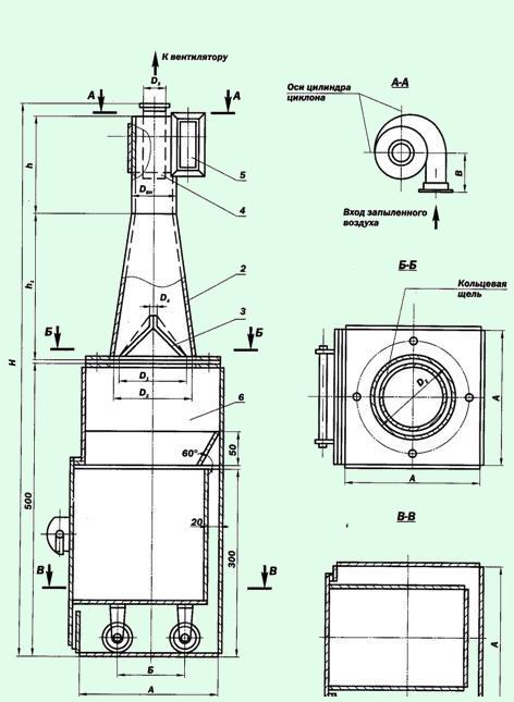 Циклон состоит из цилиндрической части корпуса с завихрителем в виде "улитки", расширяющейся к низу конической части корпуса и пылесборника. Пылесборник может быть в виде бункера или выдвижного ящика. Бункера изготавливаются двух типов: с косым днищем и боковой выгрузкой и конической формы с выгрузкой снизу. При установке циклона на кронштейне бункер имеет коническую форму, а к пылевыпускному отверстию может подсоединятся затвор типа «мигалки» или шиберный затвор. Рекомендуется установка на кронштейне циклона диаметром не более 300 мм.Для повышения эффективности пылеосаждения и предохранения пыли от уноса из бункера в нижней части циклона устанавливается внутренний конус.