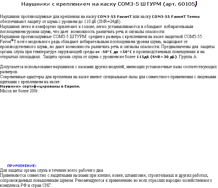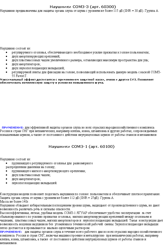 ПРИМЕНЕНИЕ: для эффективной защиты органов слуха во всех отраслях народнохозяйственного комплекса России и стран СНГ при механических, например клепка, ковка, штамповка и других работах, сопровождаемых повышенным шумом, а также от постоянного действия внутрицеховых шумов от работы станков и механизмов