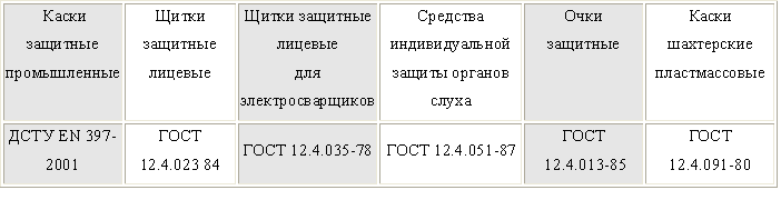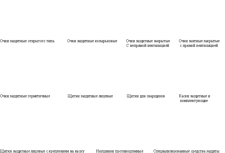 Индивидуальные средства защиты - каски,очки,щитки лицевые,наушники,щитки для сваршиков. В системе мероприятий по охране труда обеспечение средствами индивидуальной защиты (СИЗ) занимает одно из ведущих мест, так как их применение иногда является единственной возможностью предотвратить воздействия(исключить действие) вредные и опасные производственных факторов.