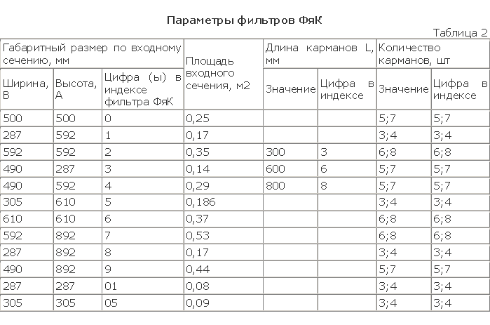 В таблице 2 указаны основные стандартные типоразмеры и параметры карманных фильтров.