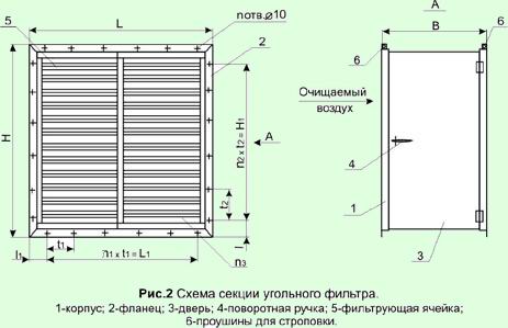 Секция угольного фильтра СУФ состоит из металлического корпуса 1 имеющего фланец 2 на входе и выходе. Отверстия во фланцах предназначены для соединения СУФ с соответствующими фланцами вентиляционной системы на болтах через уплотнительную резину.