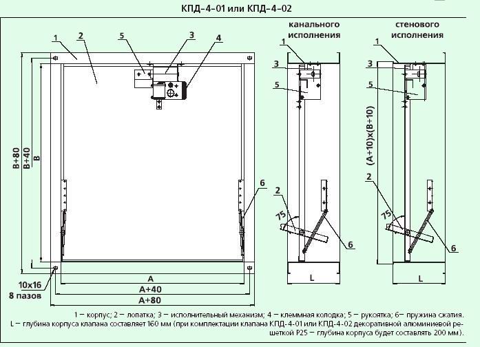 Канальное исполнение клапана КПД-4 предназначено для встраивания в вентиляционный канал (систему воздуховодов) или присоединения к стеновой преграде или перекрытию. Стеновое исполнение клапана КПД-4 предназначено для облегчения заделки клапана в шахту, стеновое или потолочное перекрытие, отличается от канального наличием только одного присоединительного фланца и отсутствием на наружной поверхности клапана движущихся или вращающихся частей и обслуживаемых узлов: вся кинематика такого клапана размещается в его внутренней полости. Электромагнит на клапане КПД-4 стенового или канального исполнения всегда размещается внутри клапана. Электропривод на клапане КПД-4 канального исполнения (два присоединительных фланца) всегда размещается только снаружи клапана, на клапане стенового исполнения (один присоединительный фланец) - всегда только внутри клапана. Температура окружающей среды для обеспечения нормальной работоспособности клапанов во всех его исполнениях может устанавливаться в пределах -60...+40 "С.