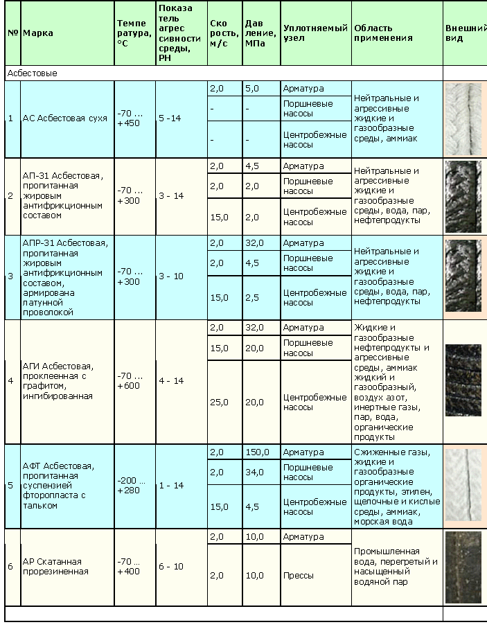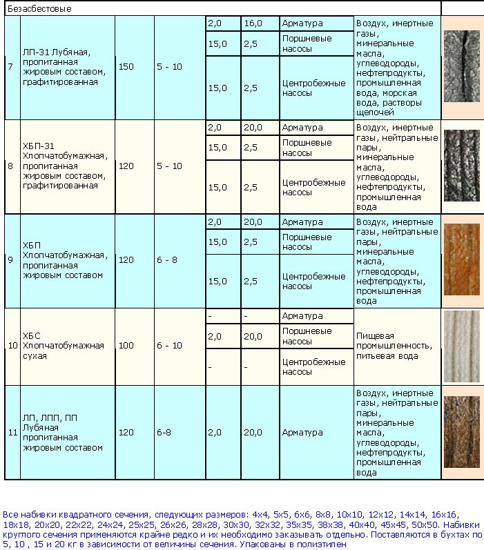 - безасбестовые: сальниковая набивка из натуральных нитей (хлопок, пенька) и искуственных нитей (терморасширенный графит, тефлон PTFE, кевлар и т.д.), керамические ткани, керамические шнуры, стеклоткани, стеклошнуры