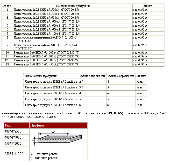 Рассматриваемая конвейерная лента изготавливается на основе ткани БКНЛ-65: эта ткань (БКНЛ-65) состоит из полиэфира и хлопка, разрывное тяговой прокладки составляет 55 Н/мм., толщина 1-й прокладки ~ 1 мм.;