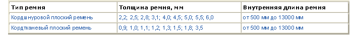 Таблица: размеры прорезиненных плоских бесконечных ремней