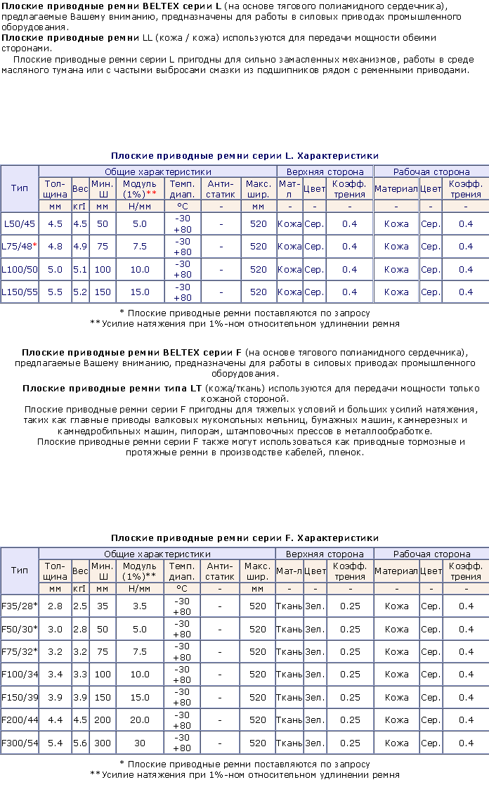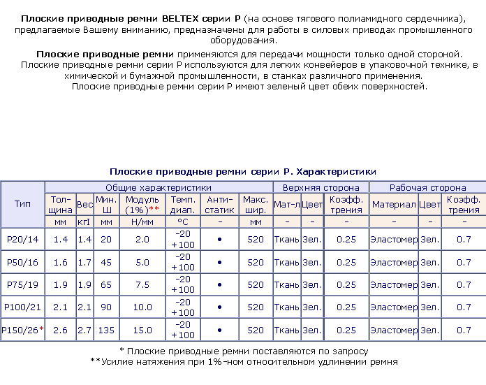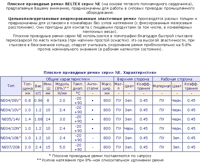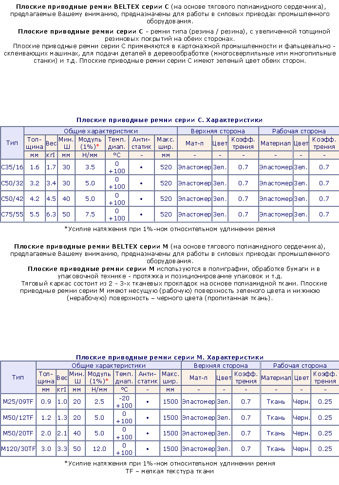 Плоские приводные ремни из синтетических материалов ТУ -17-21-598-87 (толщина до 0,8 мм и ширина до 400 мм) обладают высокой прочностью и износоустойчивостью при эксплуатации в неагрессивной среде, при