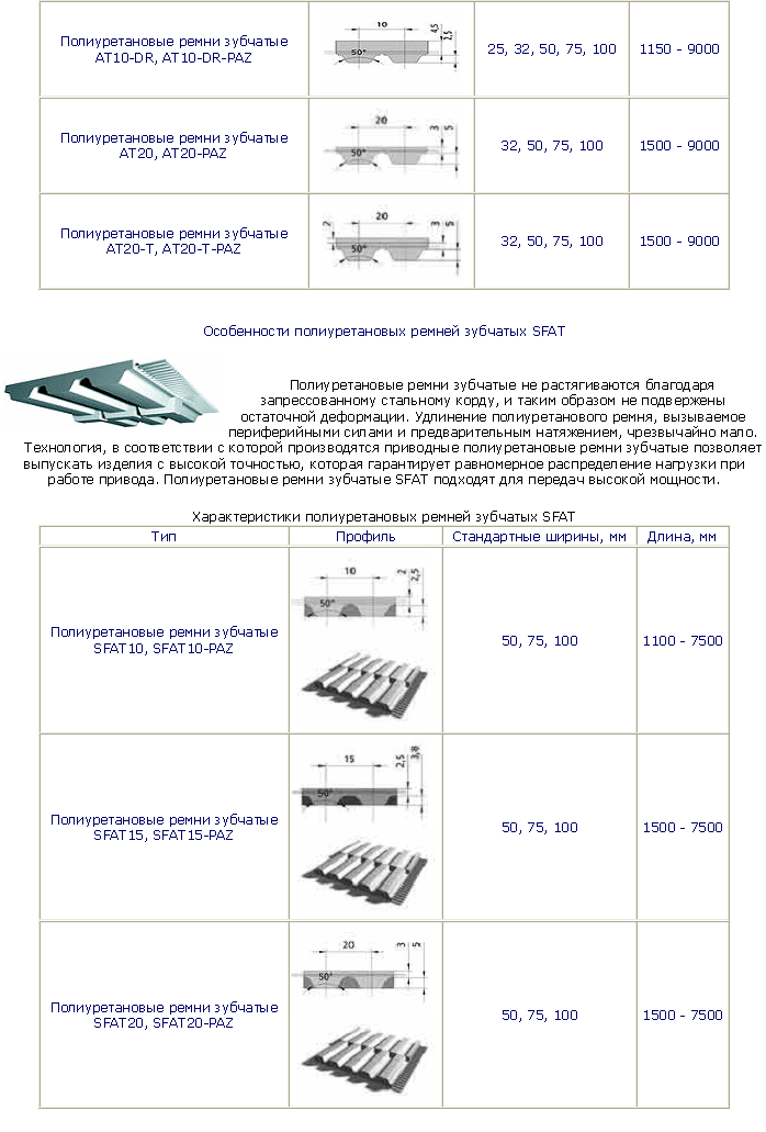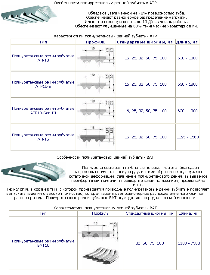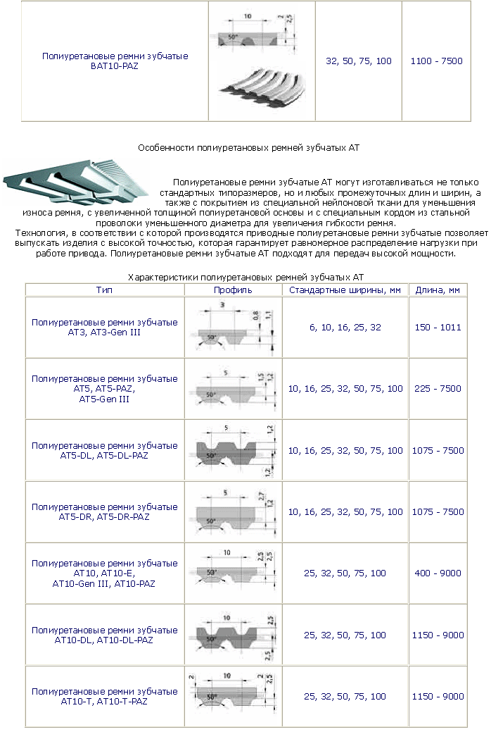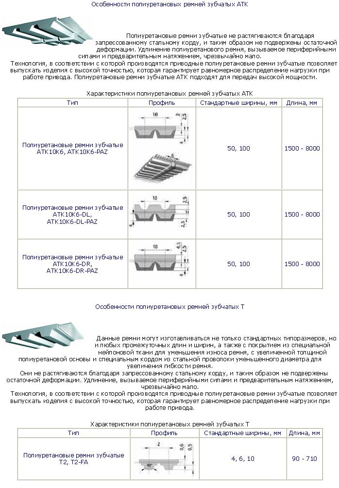 Полиуретановые ремни зубчатые выпускаются с трапецевидной формой зуба как в классическом дюймовом варианте (MXL, XL, L, H), так и с метрическим шагом - Т2,5, Т5, Т10, Т20 и в усиленном варианте АТ3, АТ5, АТ10,АТ20. Под заказ изготавливаются полиуретановые ремни с полукруглой формой зуба (HTD 3M, 5M, 8M, 14M и STD 5M, 8M).