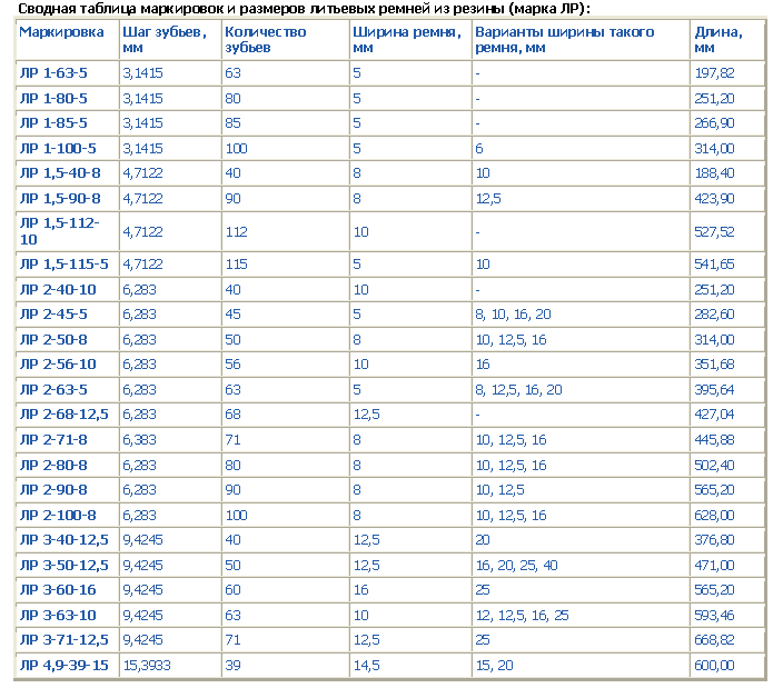 Т. о. ремень с маркировкой ЛР 1 - 112 - 10 имеет 112 зубьев, его ширина 10 мм, а расстояние между вершинами соседних зубов, составляет 3,1415 мм.