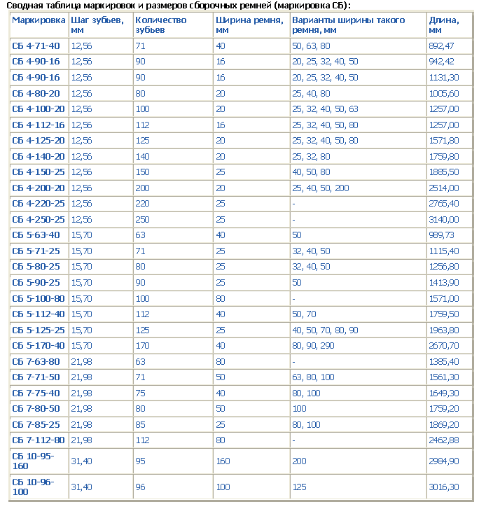 Сборочные зубчатые ремни - маркировка: СБ (ТУ 38 405 560-84) - состоят из несущего слоя на основе металлокорда (или другого армирующего материала), резины и тканевого покрытия на зубчатой поверхности, вулканизированных в одно изделие. Плоскозубчатые приводные ремни типа СБ (сборочные) имеют трапецеидальную форму зуба. Они изготовлены из полихлоропреновой резины (неопрен), обеспечивающей высокие показатели износостойкости и стойкости к индустриальным маслам. Каркас ремня - это латунированный металлокорд, придающий ремню высокую прочность и стабильность размеров