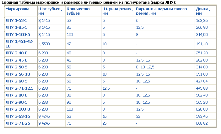 Литьевые ремни из резины маркируются буквами "ЛР", а ремни из полиуретана - маркируются буквами "ЛПУ".