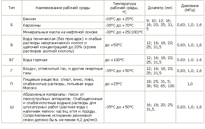 Рукава предназначены для подачи под давлением : тип Б - бензина при температуре от -35°С до +25°С; керосина при температуре от -35°С до +70°С; минерального масла на нефтяной основе при температуре от -35°С до +100°С.