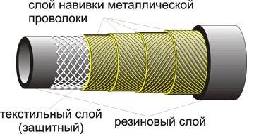 Рукава состоят из внутреннего и наружного резиновых слоев, текстильного защитного слоя, четырех силовых слоев латунированной проволоки (два с правым направлением навивки, два с левым направлением навивки), с промежуточными резиновыми слоями. Рукава маслобензостойкие