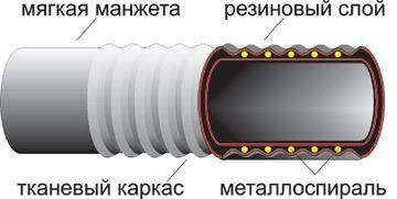 Рукава изготавливаются с текстильным внутренним каркасом, металлической спиралью, на концах с мягкими манжетами, диаметром: 25, 32, 38, 50, 65, 75, 100 мм.