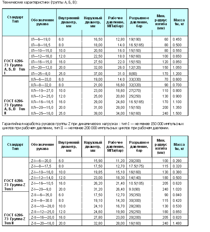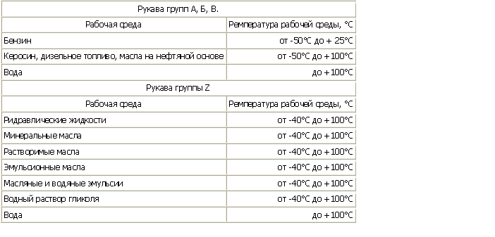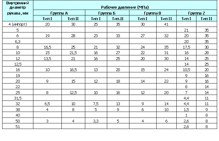 Каждый тип рукава высокого давления по разрывному усилию делят на группы А, Б, В, Z