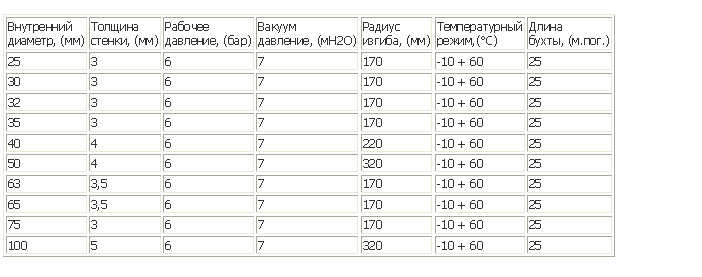 Свойства: шланг из термопластичной резины, армированный стальной спиралью и кордом из полиэстера. Стойкий к истиранию, старению, атмосферному воздействию и озону.