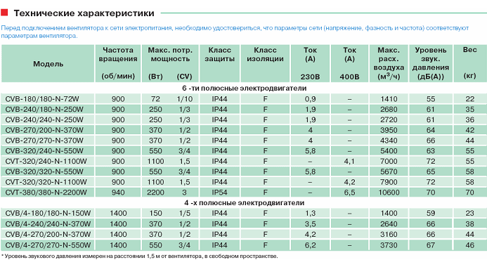 Класс защиты IP55, класс изоляции F, со встроенными термоконтактами. Параметры электропитания: 1ф - 230 В - 50 Гц. (CHVB) 3ф - 400 В - 50 Гц. (CHVT) Вентиляторы имеют возможность регулирования скорости напряжением. Рабочая температура от -40OС до +120OС