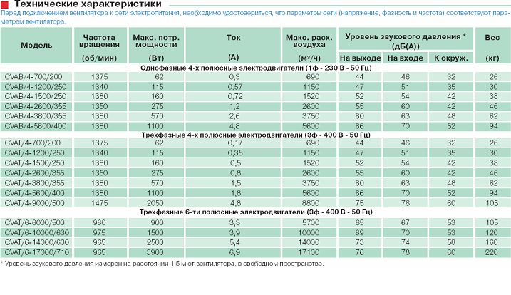 В зависимости от модели, вентиляторы комплектуются 4 или 6 полюсными однофазными или трехфазными электродвигателями
