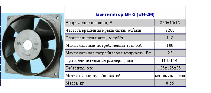 Вентиляторы ВН-2 предназначены для охлаждения нагревающихся узлов и блоков радиоэлектронной аппаратуры, в системах управления станков с ЧПУ и для снижения температуры в различных промышленных приборах и блоках управления. Не создают радиопомех, компактен, благодаря подшипникам качения надёжны в работе. Корпус вентилятора изготовлен из алюминиевого сплава. Питание вентилятора осуществляется от однофазной сети переменного тока 220В, 50Гц