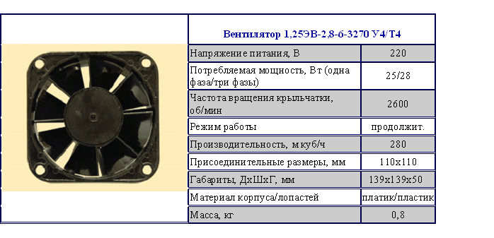 Вентиляторы типа 1,25ЭВ-2.8-6-3270-У4/Т4 и 1,0ЭВ предназначены для охлаждения электронных схем блоков управления и другого промышленного оборудования. Корпус и крыльчатка изготовлены из пластика, двигатель оснащен подшипниками качения. Питание вентилятора осуществляется от однофазной или трехфазной сети переменного тока 220В, 50Гц. Срок службы 12500 часов